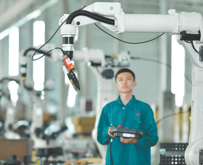 河北省任丘市通過搭建科技創(chuàng)新平臺(tái),建設(shè)研發(fā)中心、技術(shù)研究院,持續(xù)深化產(chǎn)學(xué)研合作交流,推動(dòng)企業(yè)轉(zhuǎn)型升級(jí)。圖為工作人員在生產(chǎn)車間調(diào)試機(jī)器人。 |