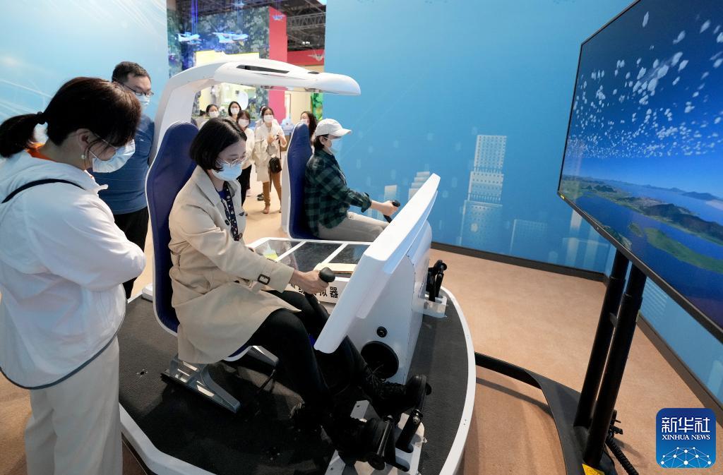 10月7日,觀眾在“奮進新時代”主題成就展上體驗操縱直升機訓練模擬器。當日是國慶長假的最后一天,大批觀眾來到北京展覽館參觀“奮進新時代”主題成就展。新華社記者王毓國 攝