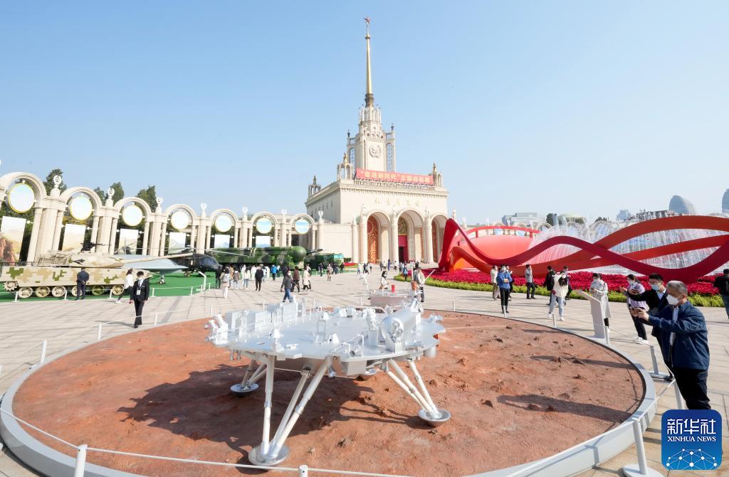 10月7日,觀眾在“奮進新時代”主題成就展上參觀天問一號著陸器模型。當日是國慶長假的最后一天,大批觀眾來到北京展覽館參觀“奮進新時代”主題成就展。新華社記者王毓國 攝