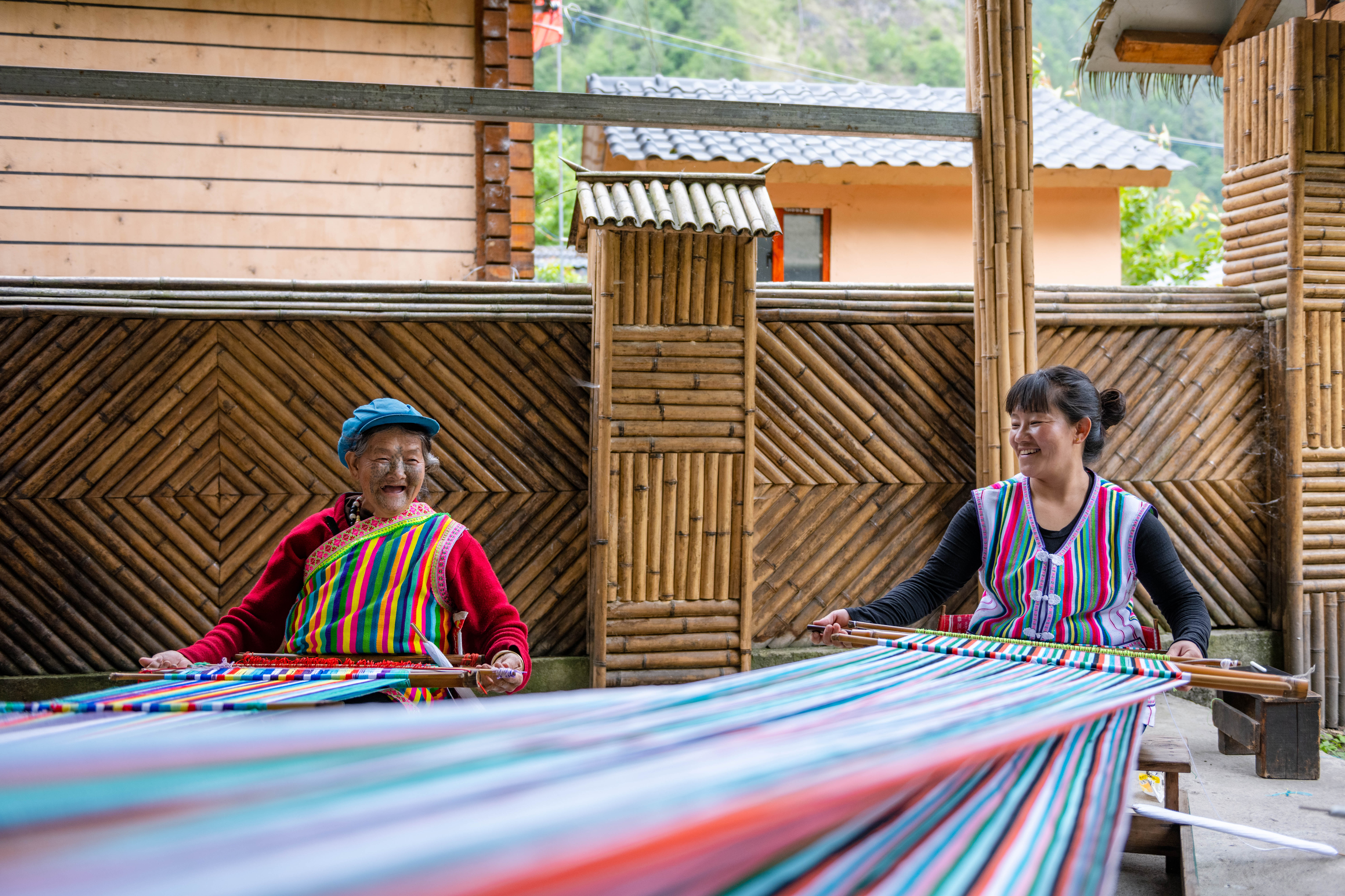 在云南省貢山獨龍族怒族自治縣獨龍江鄉(xiāng)迪政當(dāng)村,獨龍族老人李文仕(左)和女兒在編織獨龍?zhí)海?022年5月10日攝)。新華社記者 曹夢瑤 攝