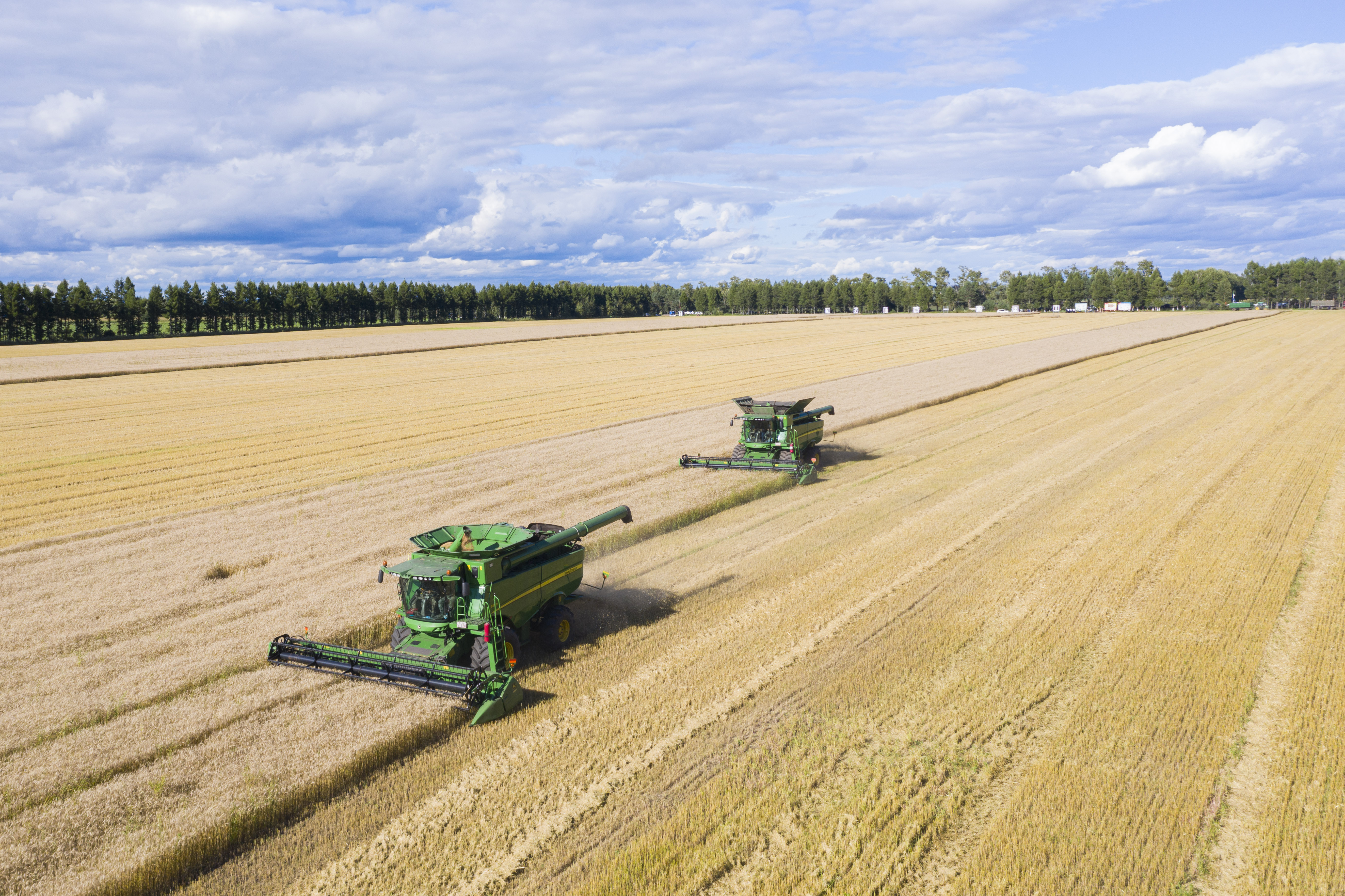 聯(lián)合收割機在黑龍江北大荒集團紅星農(nóng)場有限公司田間收獲小麥(2022年8月10日攝,無人機照片)。新華社記者 謝劍飛 攝