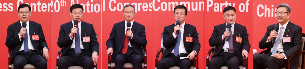 10月20日,中國共產黨第二十次全國代表大會新聞中心舉行集體采訪。青海、寧夏、新疆、中央和國家機關、中央金融系統(tǒng)、中央企業(yè)系統(tǒng)(在京)代表團新聞發(fā)言人出席,介紹代表團學習討論二十大報告情況,并回答記者提問(拼版照片)。新華社記者 張玉薇 攝