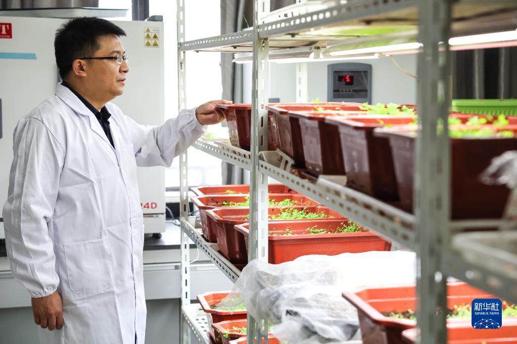 10月20日,貴州大學(xué)動(dòng)物科學(xué)學(xué)院院長(zhǎng)陳超在實(shí)驗(yàn)室內(nèi)觀察新品種牧草的生長(zhǎng)情況。新華社記者 歐東衢 攝