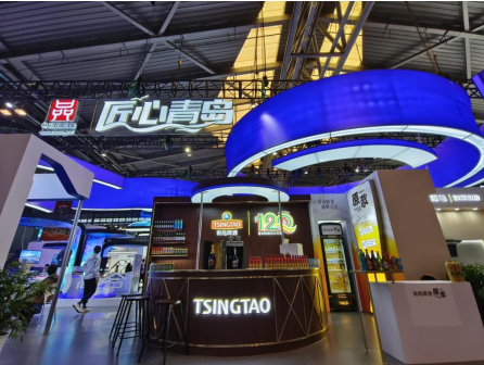 與往年展會不同,青島啤酒在展臺設(shè)計上,一枚紅、綠、金三色勾勒的120周年紀(jì)念標(biāo)識,格外引人注目,試飲杯中、啤酒泡沫上,紀(jì)念標(biāo)識的拉花與之呼應(yīng)成趣。