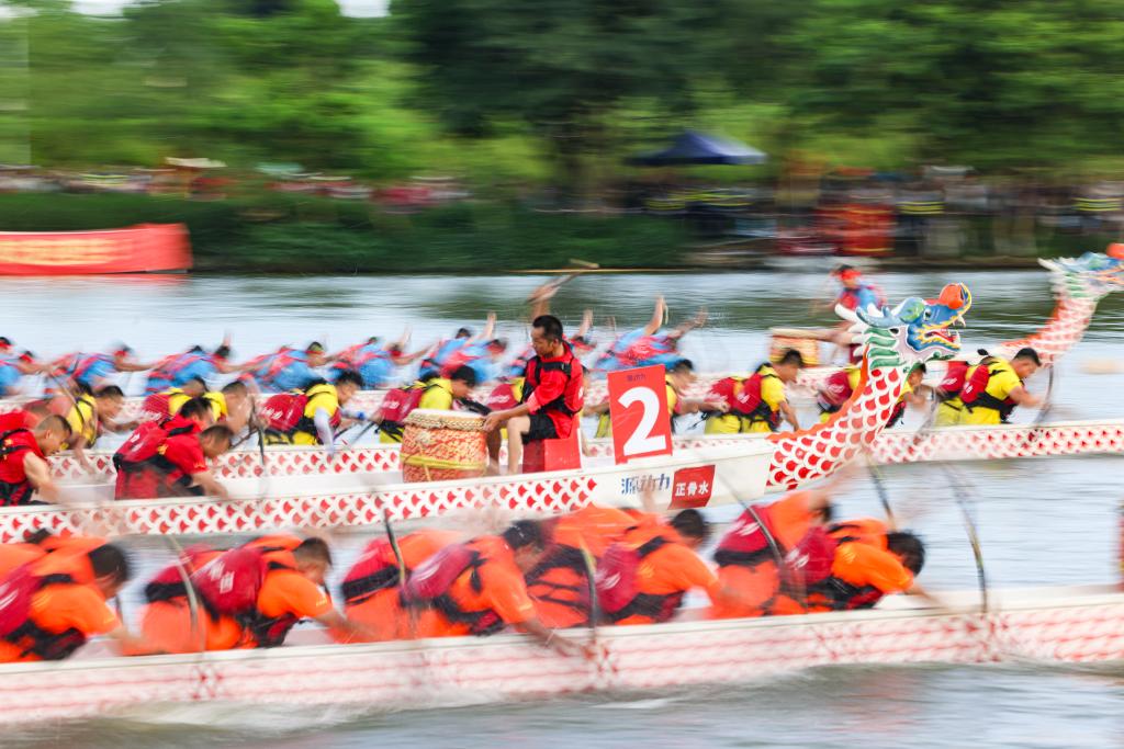 6月20日,在廣西玉林園博園,選手進(jìn)行龍舟競賽。新華社記者 胡星宇 攝