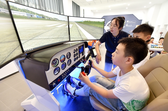 7月10日,在石家莊市融創(chuàng)中心第一小學(xué),學(xué)生在老師的指導(dǎo)下進(jìn)行飛行模擬駕駛。張曉峰/攝(新華社發(fā))