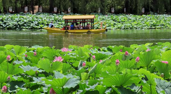 隨著暑假的到來(lái),各地迎來(lái)暑期旅游旺季。7月9日,游人在北京市圓明園遺址公園內(nèi)乘船游玩。新華社記者 李欣 攝