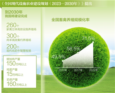 規(guī)?;O(shè)施化養(yǎng)殖助推畜牧業(yè)綜合產(chǎn)能提升?!度珖F(xiàn)代設(shè)施農(nóng)業(yè)建設(shè)規(guī)劃(2023—2030年)》(以下簡稱《規(guī)劃》)提出,到2030年建設(shè)完成260個家禽立體高效設(shè)施養(yǎng)殖場、200個肉牛高效集約養(yǎng)殖場、300個肉羊高效集約養(yǎng)殖場和200個現(xiàn)代化奶牛智慧牧場,增加肉產(chǎn)量150萬噸以上、雞蛋產(chǎn)量15萬噸以上、奶類產(chǎn)量160萬噸以上,我國的肉蛋奶供應(yīng)保障水平將進一步提高。