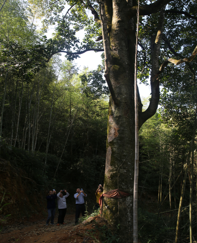 若非親眼所見,簡直難以置信,眼前是一棵三個成年男子都難以環(huán)抱的含笑,一棵常被用來點綴的綠化樹,竟長成二三十米高的參天大樹,它長出了人們的經(jīng)驗范疇,讓人一下失去贊美的語言。這么高大的含笑不要說是全縣,就是全市、全省甚至全國也為之罕見。巧的是,這棵參天大含笑,又恰好長在必經(jīng)之地的古道山蔭處,自然為世人所銘記。