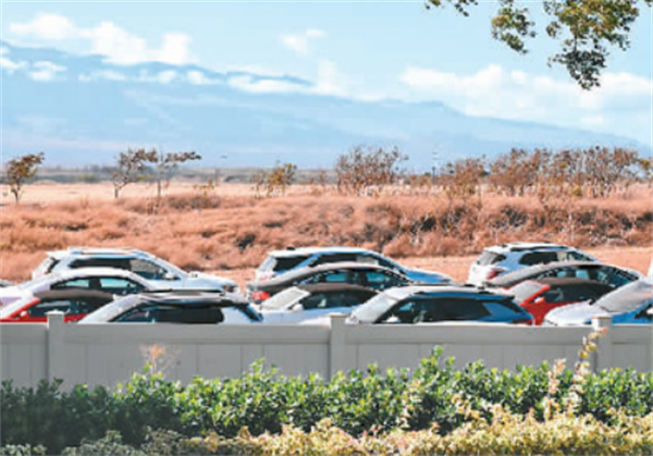 8月24日,美國(guó)夏威夷毛伊島卡胡盧伊機(jī)場(chǎng)外的一片空地上停放著租車公司沒(méi)有租出去的汽車。