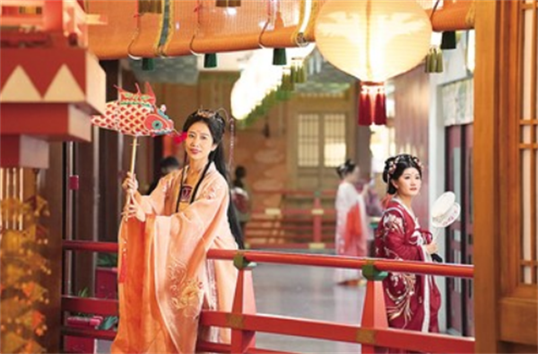 在遍布名勝古跡的西安市內(nèi),還有一座“平行時(shí)空里的長(zhǎng)安”。走進(jìn)長(zhǎng)安十二時(shí)辰主題街區(qū),游客不僅可以身著唐代服飾穿行在市井街區(qū),與游街花魁來(lái)個(gè)親密接觸,還能手握“開(kāi)元通寶”代幣,到酒肆里買壺好酒,觀看歌舞。