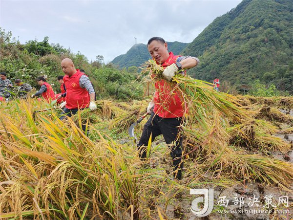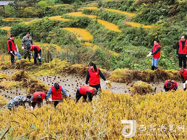 在青山的映襯下,金色的稻浪使得社火坪村水稻梯田呈現(xiàn)出漫山鋪金的景象。鎮(zhèn)機(jī)關(guān)和社火坪村黨員、干部紛紛加入志愿者隊(duì)伍,他們熱情高漲、干勁十足,紛紛挽起褲腳,擼起袖子,割谷、遞把、打谷、裝運(yùn),一派忙碌有序的景象呈現(xiàn)在稻田里。紅色馬甲身影在金黃色的稻田里來回穿梭,沉甸甸的稻穗在志愿者手中晃動出節(jié)奏韻律,空氣中飄散著新鮮稻谷的芳香,每個人臉上都洋溢著豐收的喜悅。