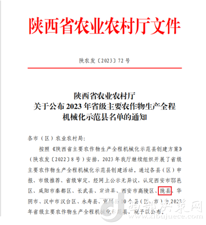 西部決策網(wǎng)訊(張隴峰 通訊員 趙永利)近期,陜西省農(nóng)業(yè)農(nóng)村廳公布了2023年省級(jí)主要農(nóng)作物生產(chǎn)全程機(jī)械化示范縣名單,寶雞市隴縣作為寶雞市唯一入選的縣區(qū),榜上有名。這標(biāo)志著隴縣農(nóng)業(yè)機(jī)械化發(fā)展進(jìn)入了一個(gè)全新的高度,農(nóng)業(yè)現(xiàn)代化向前邁出了堅(jiān)實(shí)的一步。
